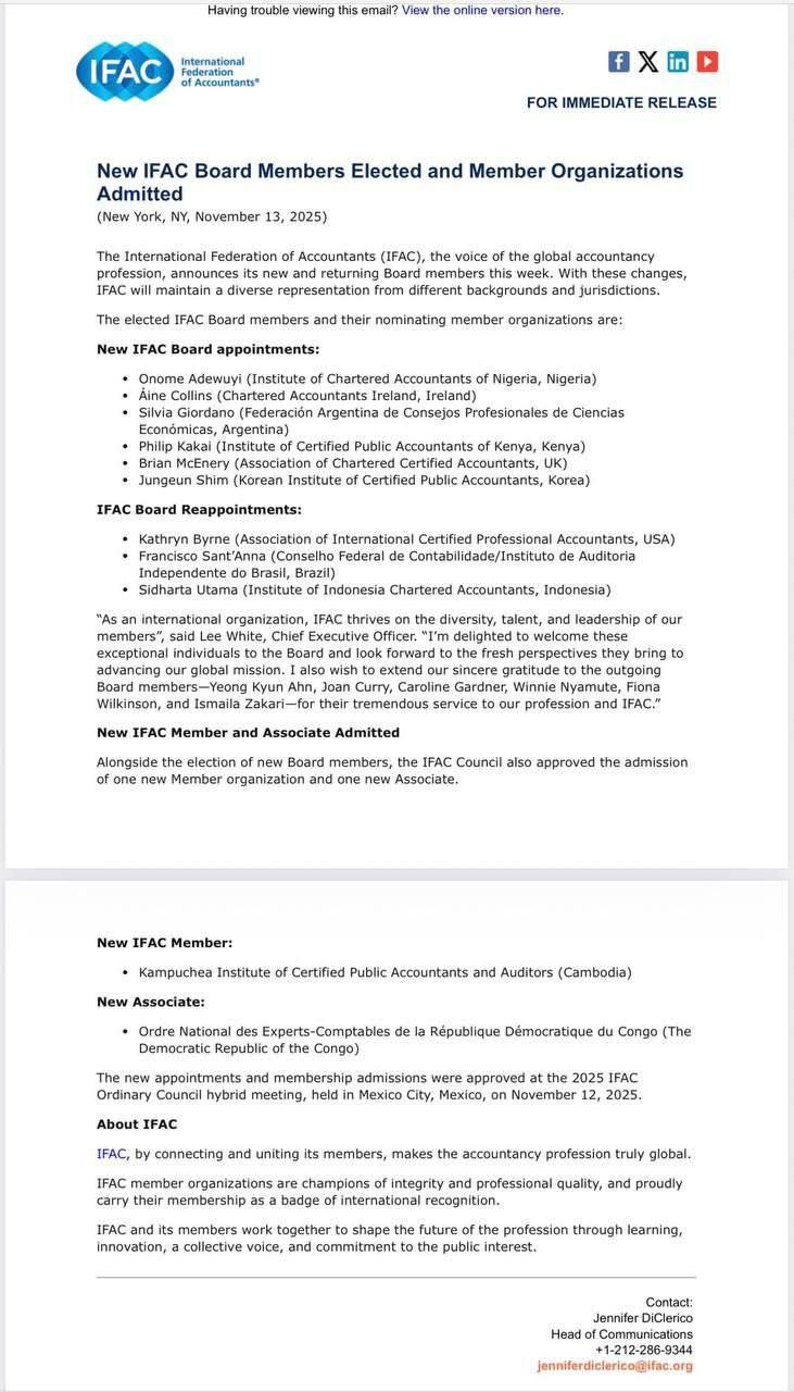 វិទ្យាស្ថានគណនេយ្យករជំនាញ និងសវនករកម្ពុជា (វ.គ.ស.ក.) មានកិត្តិយសសូមប្រកាសជាផ្លូវការ នៅថ្ងៃទី១២ ខែវិច្ឆិកា ឆ្នាំ២០២៥ ក្នុងកិច្ចប្រជុំក្រុមប្រឹក្សាភិបាលនៃសហព័ន្ធគណនេយ្យករអន្តរជាតិ នៅទីក្រុងម៉ិចស៊ីកូ ក្រុមប្រឹក្សាភិបាលនៃសហព័ន្ធគណនេយ្យករអន្តរជាតិ បានអនុម័តជាឯកច្ឆន្ទ (១០០ភាគរយ) ឱ្យវិទ្យាស្ថានគណនេយ្យករជំនាញ និងសវនករកម្ពុជា (វ.គ.ស.ក.) ក្លាយជាសមាជិកពេញសិទ្ធិ របស់សហព័ន្ធគណនេយ្យករអន្តរជាតិ។