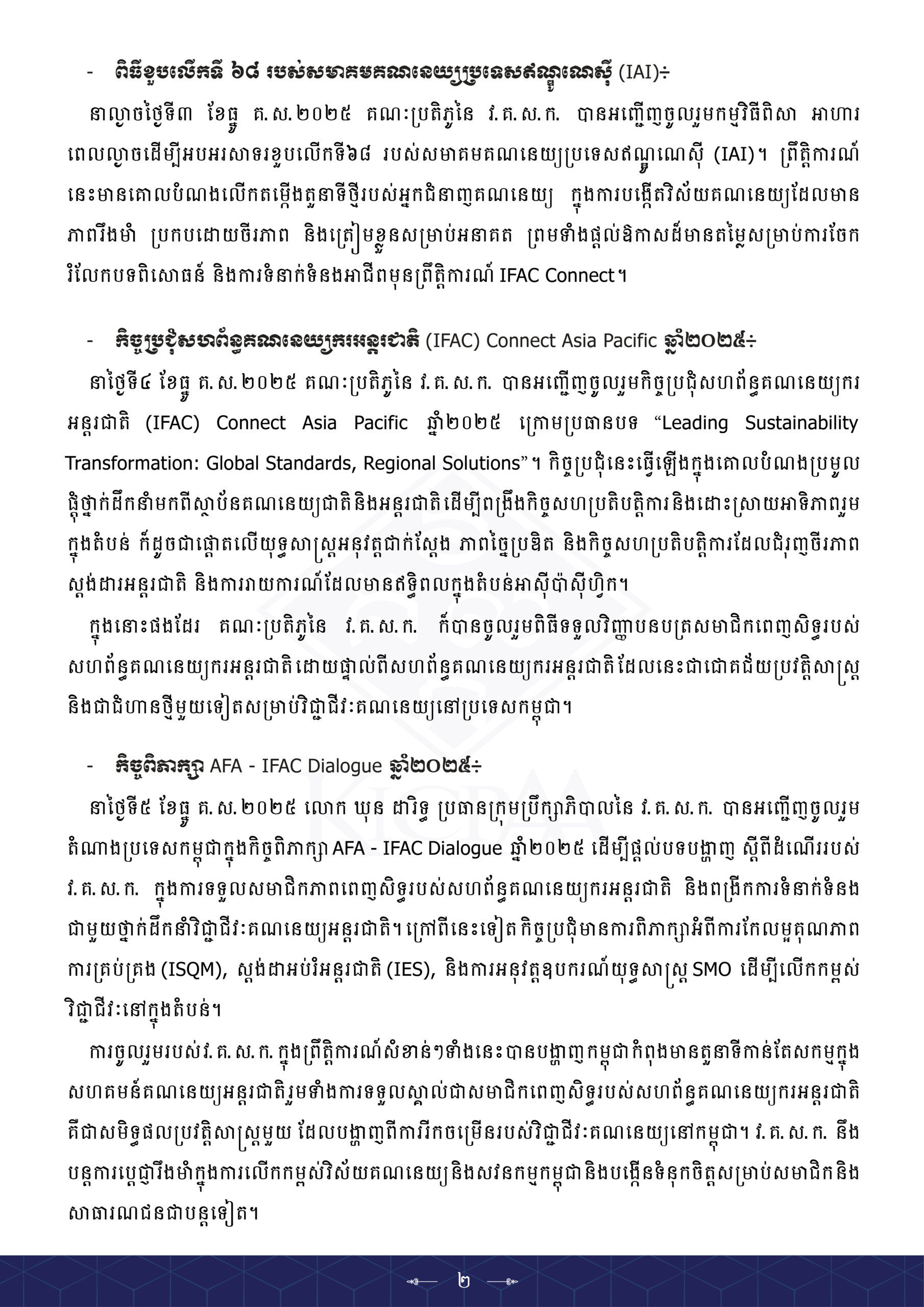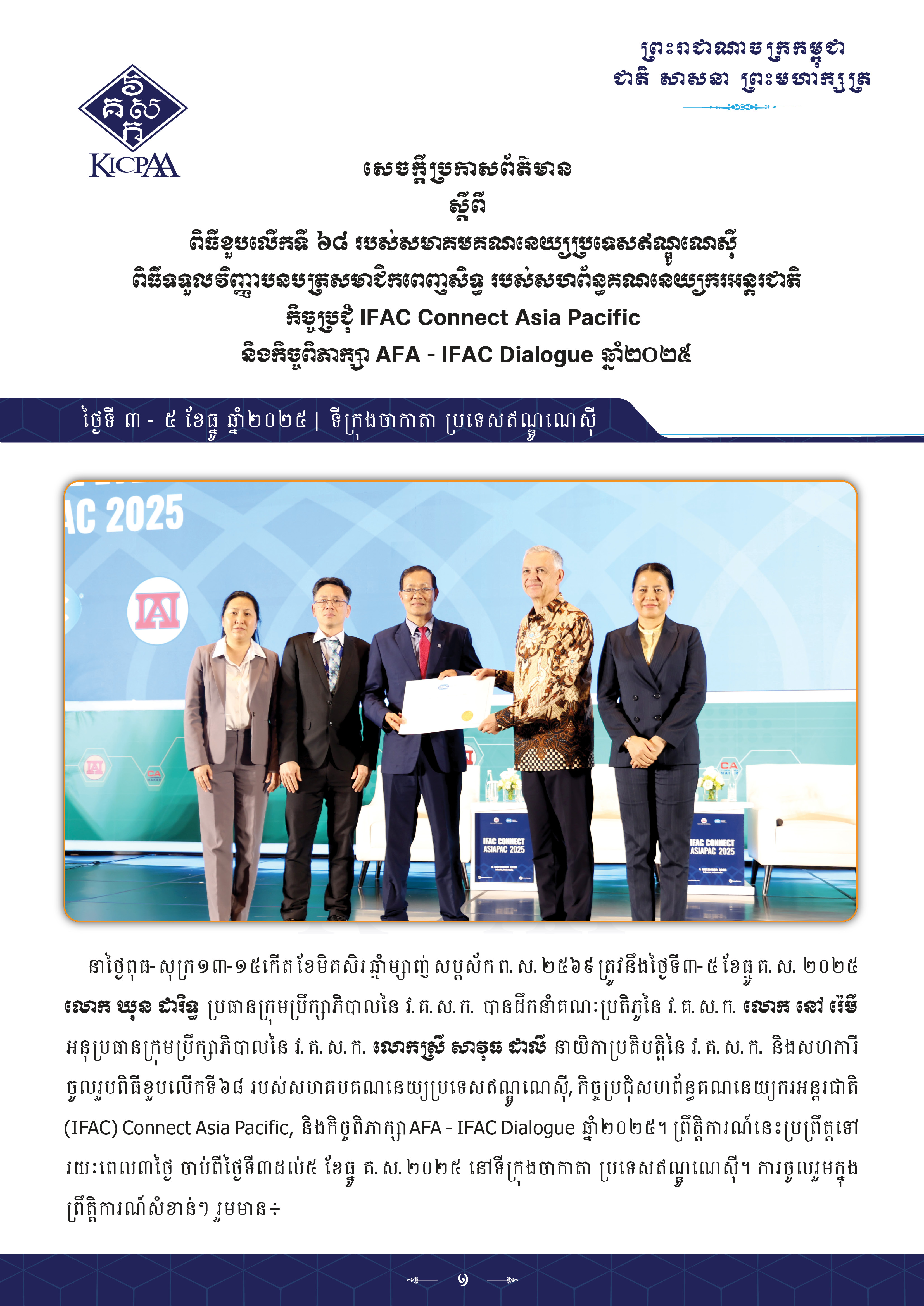 សេចក្តីប្រកាសព័ត៌មានស្តីពី ពិធីខួបលើកទី ៦៨ របស់សមាគមគណនេយ្យប្រទេសឥណ្ឌូណេស៊ី ពិធីទទួលវិញ្ញាបនបត្រសមាជិកពេញសិទ្ធ របស់សហព័ន្ធគណនេយ្យករអន្តរជាតិកិច្ចប្រជុំ IFAC Connect Asia Pacific និងកិច្ចពិភាក្សា AFA – IFAC Dialogue ឆ្នាំ២០២៥